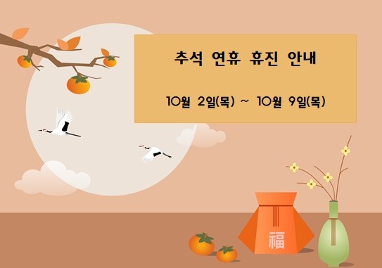 10월 2일(목) ~ 9일(목)까지 추석 연휴로 휴진합니다. 이용에 착오 없으시길 바라며 즐거운 추석 연휴 보내십시오.